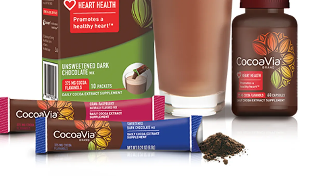 - While not all confections companies are jumping onboard, supplements like CocoaVia are seeing massive growth. CocoaVia's sales have tripled over the past year, and heart health supplements drove about double the growth that plain milk or dark chocolate sales have in the past five years, according to Euromonitor data.