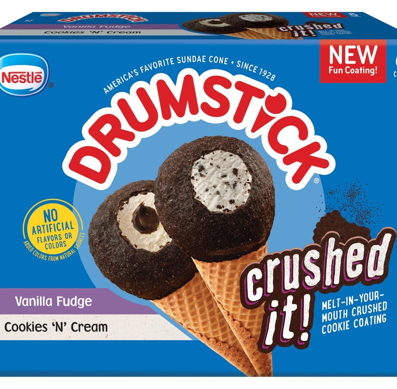 "The Drumstick brand is constantly pushing the envelope when it comes to innovation, from our unique coatings, flavors and textures to our product formats," Joanna Komvopoulos, Drumstick brand manager, said in a press release. "Knowing that Cookies 'N' Cream is a favorite flavor for so many Americans and a staple in sundae shops around the world, we developed Drumstick Crushed It! and doubled down on the experience by amplifying the melt-in-your-mouth cookie coating with our new Cookies 'N' Cream and Vanilla Fudge flavors."