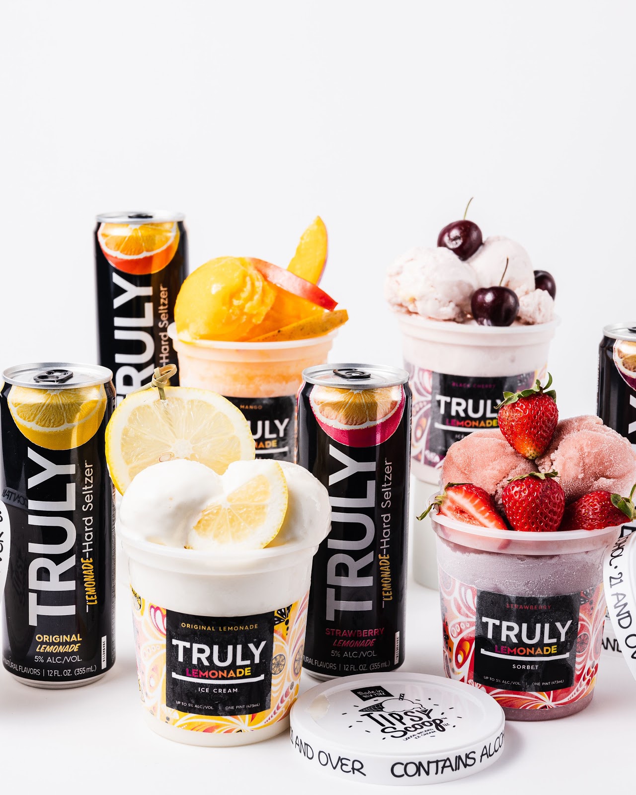 The new product line is available in four flavors based on its Truly Lemonade Hard Seltzers: Truly Strawberry Lemonade Sorbet, Truly Mango Lemonade Sorbet, Truly Original Lemonade Ice Cream and Truly Black Cherry Lemonade Ice Cream.