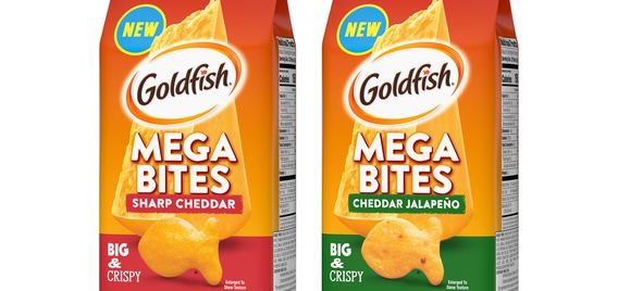 Goldfish is introducing Mega Bites, a variety that is 50% larger than the regular cracker. Created with adult consumers in mind, the fish-shaped crackers are available in two flavors: Sharp Cheddar and Cheddar Jalapeño.