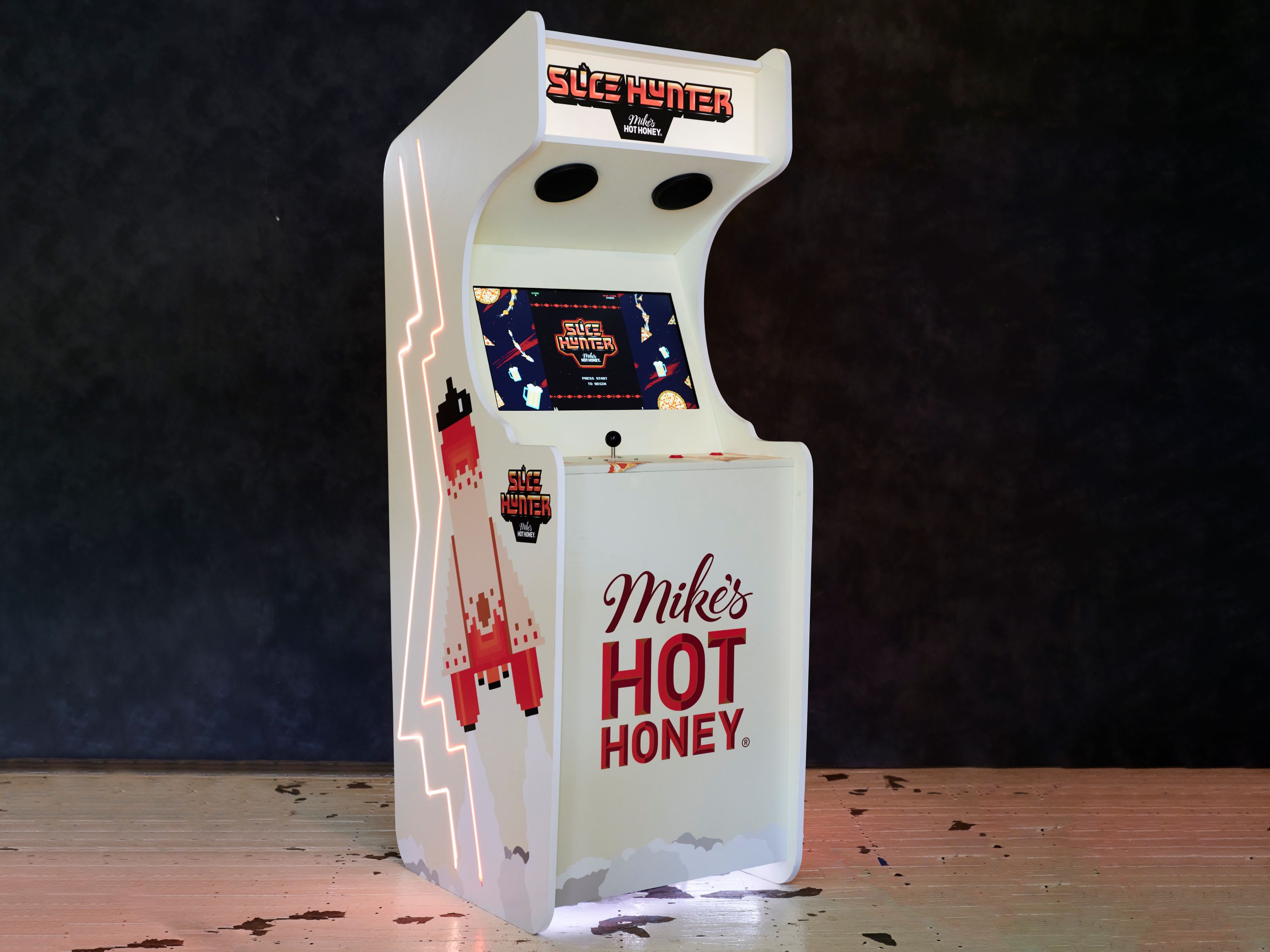 To create the game, Kurtz enlisted the help of local, NYC-based video game designers, Seth S. Scott of Perfect Hat Games and Jess Kostelnick of Design-O-Mite who designed the game to be playable as an app for the iPhone. Once the app was complete, Kurtz brought on local, bespoke video game experts Alan Winslow, Dhemerae Ford and Philip Cadoux to build the Slice Hunter arcade cabinet. The fully wrapped cabinet features built-in LED racing stripes and an illuminated marquee showcasing the original Slice Hunter logo, created by Mike’s Hot Honey design manager Marcelo Lima.