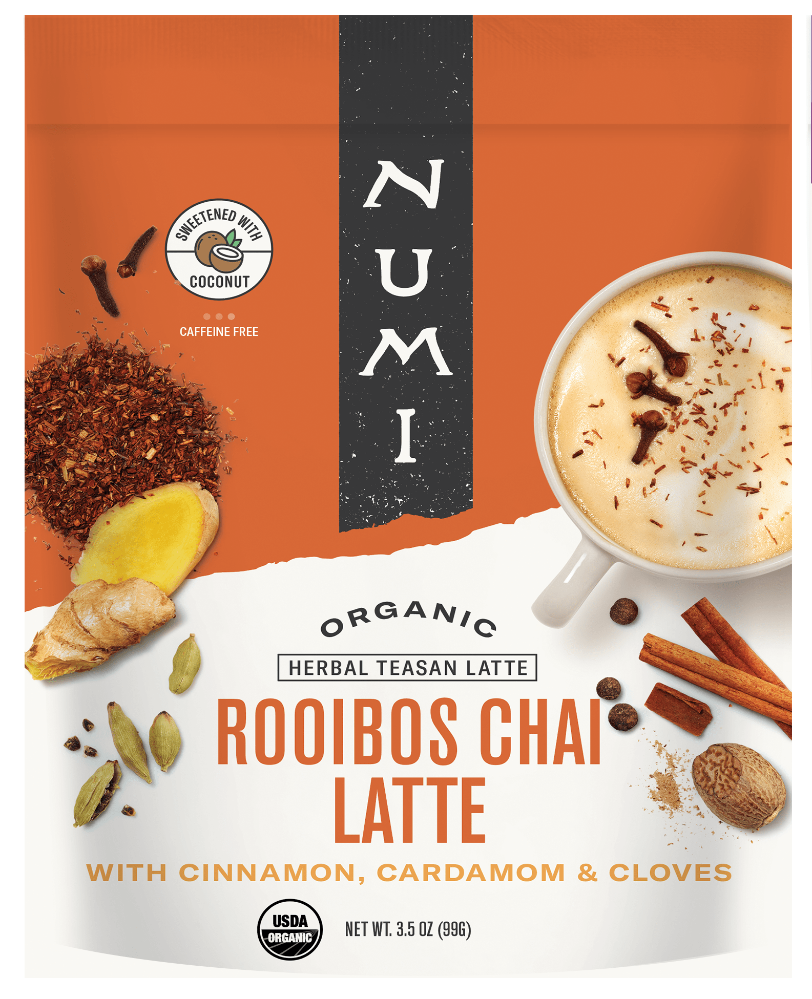 - Rooibos Chai Latte (Caffeine-Free) — Featuring a blend of organic rooibos and classic chai spices like cinnamon, ginger, and clove, this latte offers a deep, earthy, and caffeine-free indulgence. 3.5 oz./19 servings and 10 oz./56 servings