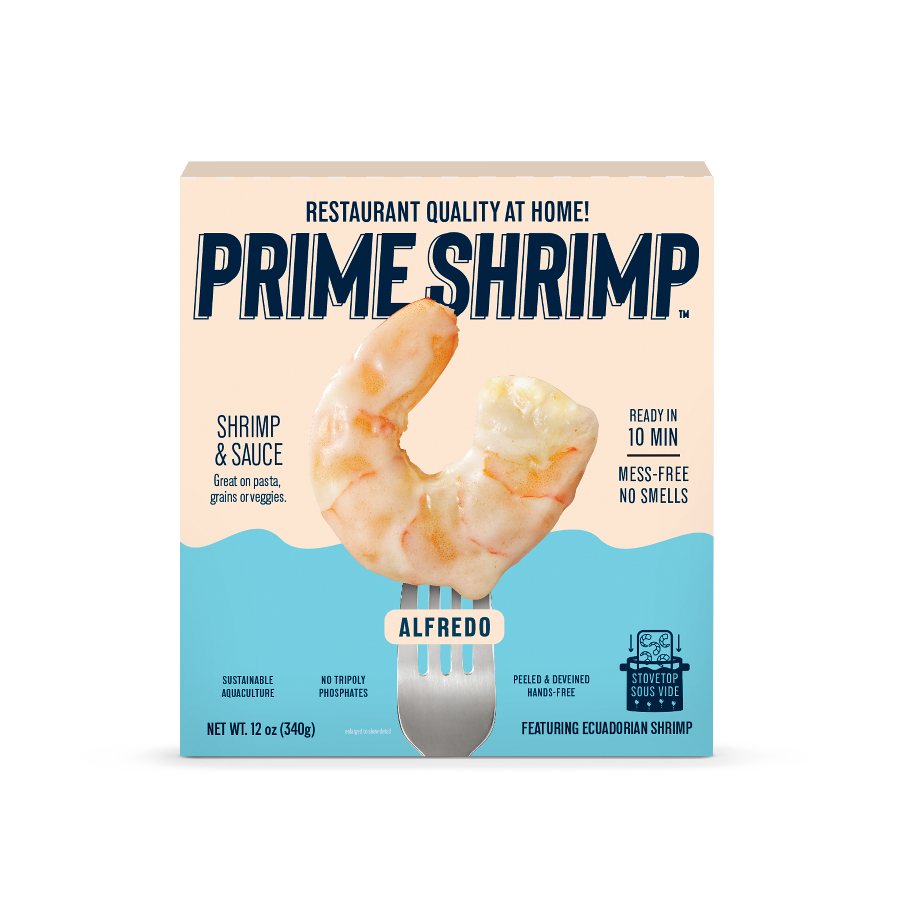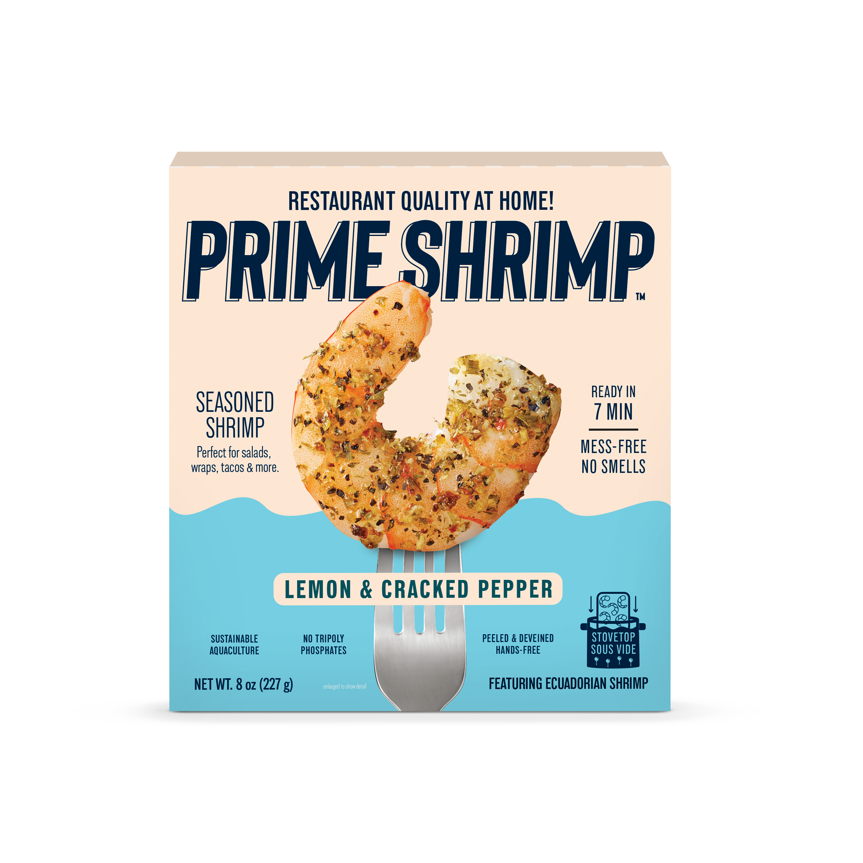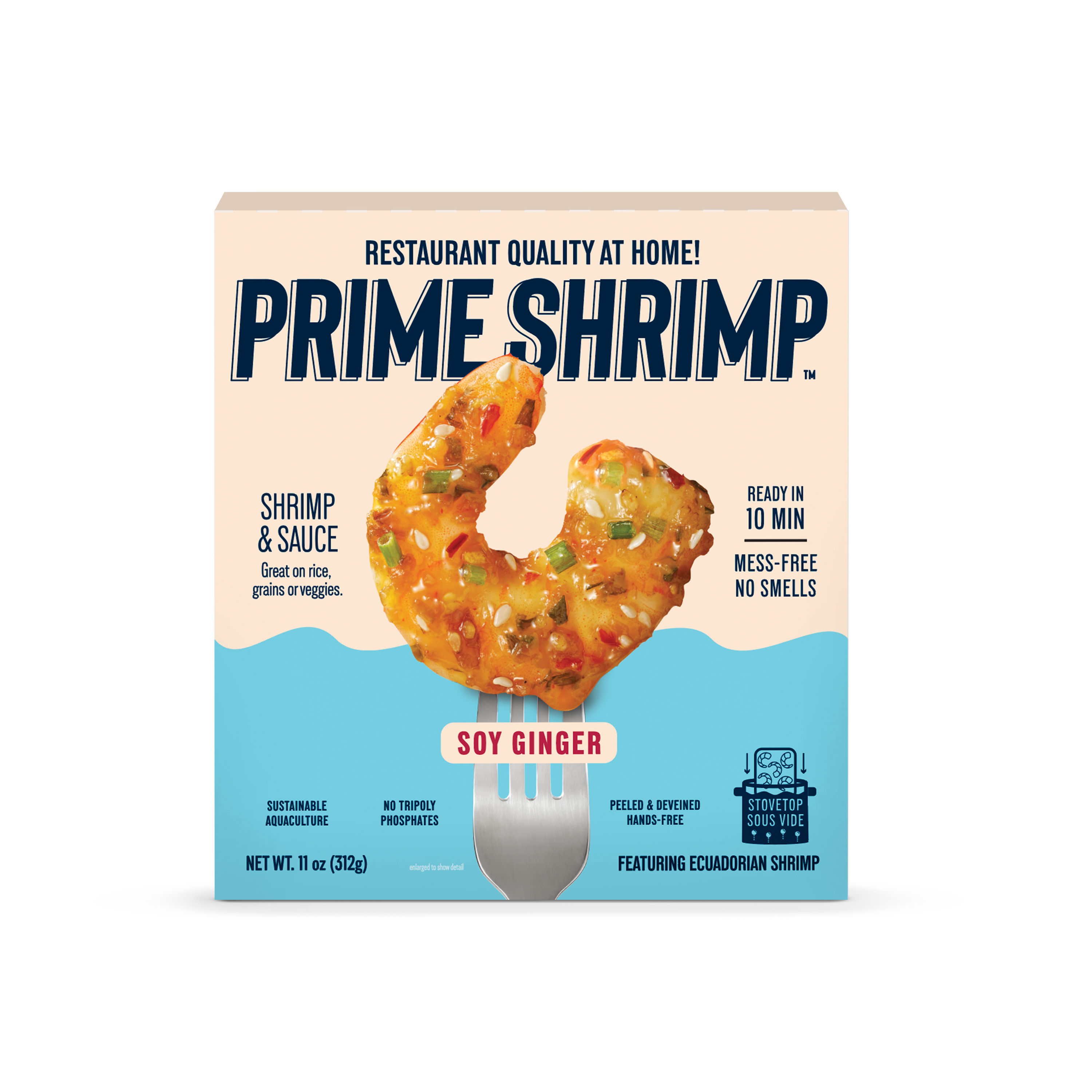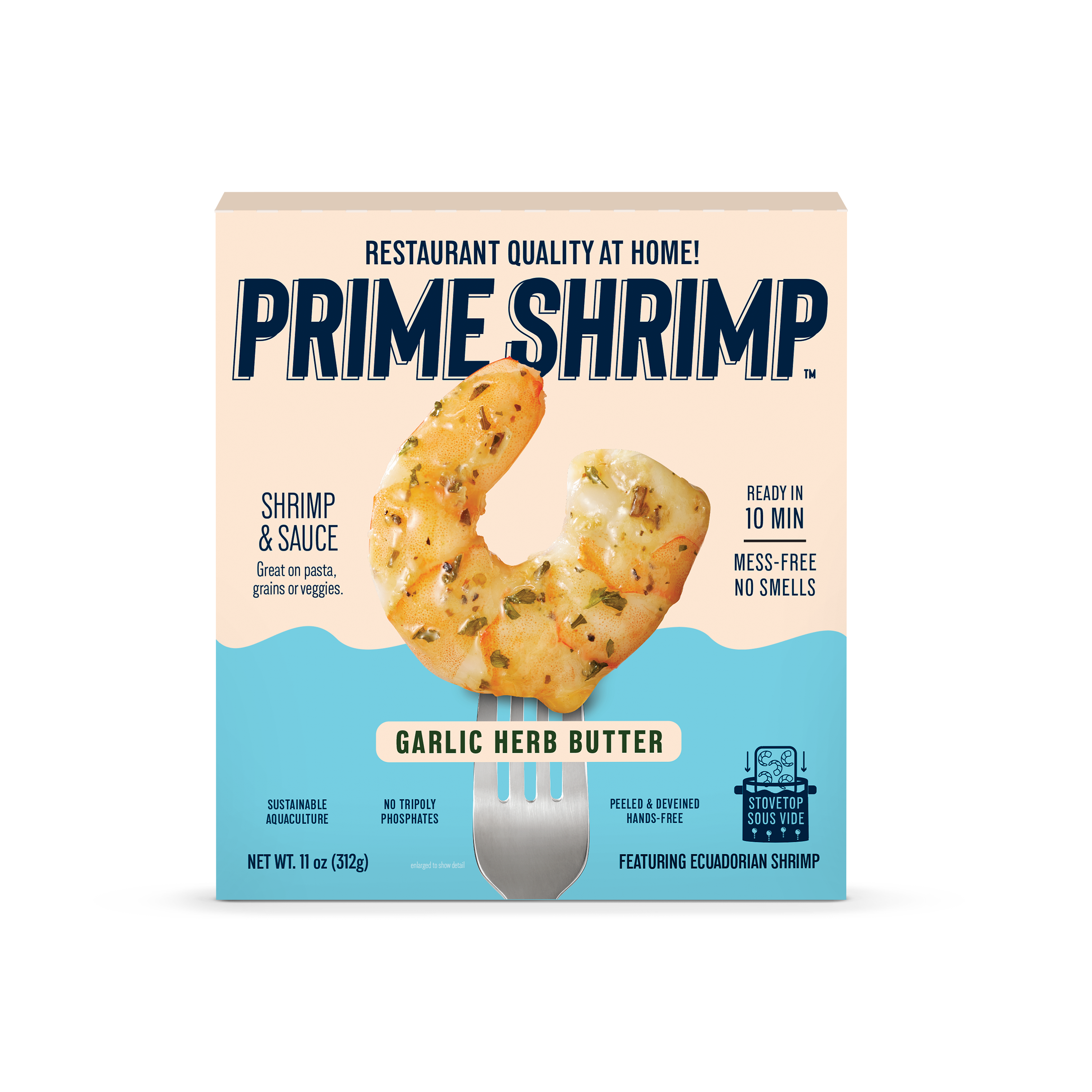 The updated brand design features bold color blocks, clean typography, and vibrant iconography that highlight the fun and flavorful essence of Prime Shrimp’s products. Packaging callouts emphasize benefits such as “sustainable sourcing,” “restaurant-quality at home,” “ready in minutes,” and “no mess, no smells”—all rooted in the brand’s mission to elevate and simplify shrimp.